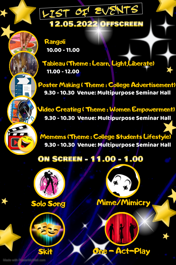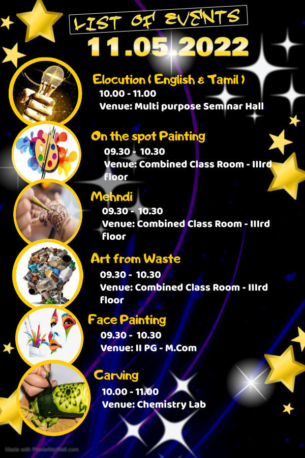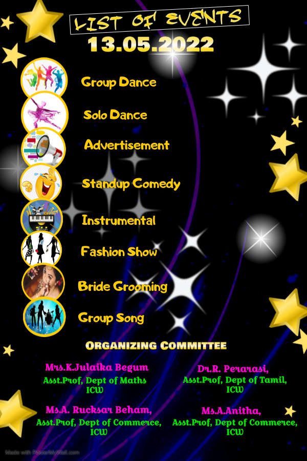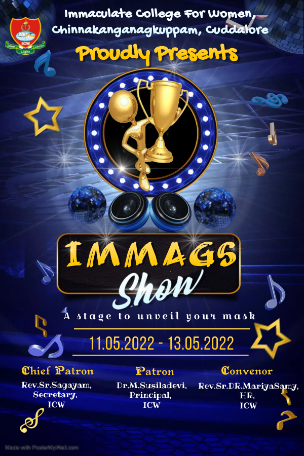 In order to explore and promote the inner hidden talents of the students, and to bring together fun, knowledge, creativity, innovation and freshness in all the aspects of our life, three days cultural fest was organized by our college. Rev. Sr. Sagaya Mary Natchathiram, our Secretary, Dr. M. Susiladevi, Our Principal i/c, Rev.Sr. Maria Samy, our HR, Mrs. Julaika Begum, Ms. Anitha, Ms. Rucksar Begum and Dr. Perarasi were the program coordinators. The backdrop was very much appreciated by all because of the hard work of the creative and the in-house team of IMMAGS.This is an event where students take a brief time off their busy schedule and strive hard to acclaim proficiency in the field of performing arts.